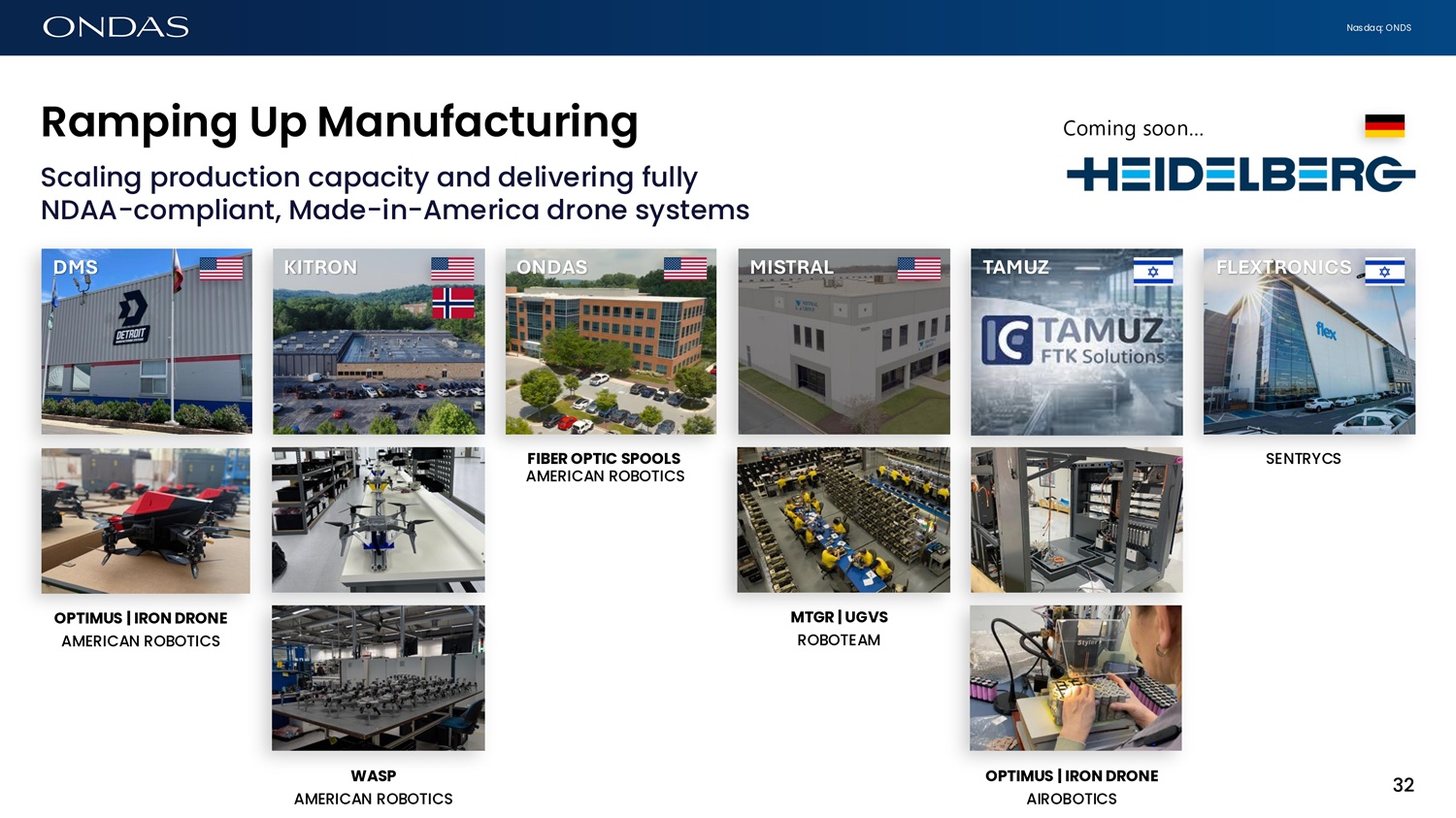 Nasdaq: ONDS 32 R6mpifig Up M6fiuf6cturifig FLEXTRONICS TAMUZ OPTIMUS | IRON DRONE AMERICAN ROBOTICS WASP AMERICAN ROBOTICS FIBER OPTIC SPOOLS AMERICAN ROBOTICS MTGR | UGVS ROBOTEAM OPTIMUS | IRON DRONE AIROBOTICS SENTRYCS Coming soon… Scaling production capacity and delivering fully NDAA - compliant, Made - in - America drone systems DMS KITRON ONDAS MISTRAL