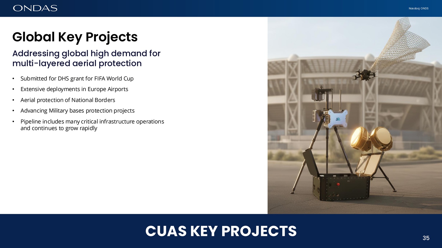 Nasdaq: ONDS Key Customer Activities ofi Efid M6rkets Programs and market segments being pursued across Ondas • CUAS programs – Global demand high • UAS Autonomous Drone Swarms Border Security • Military bases UAS & CUAS • Drone Dominance Program (DDP) • Classified Projects – Attacking Drones • De - mining efforts in Middle East 34 34