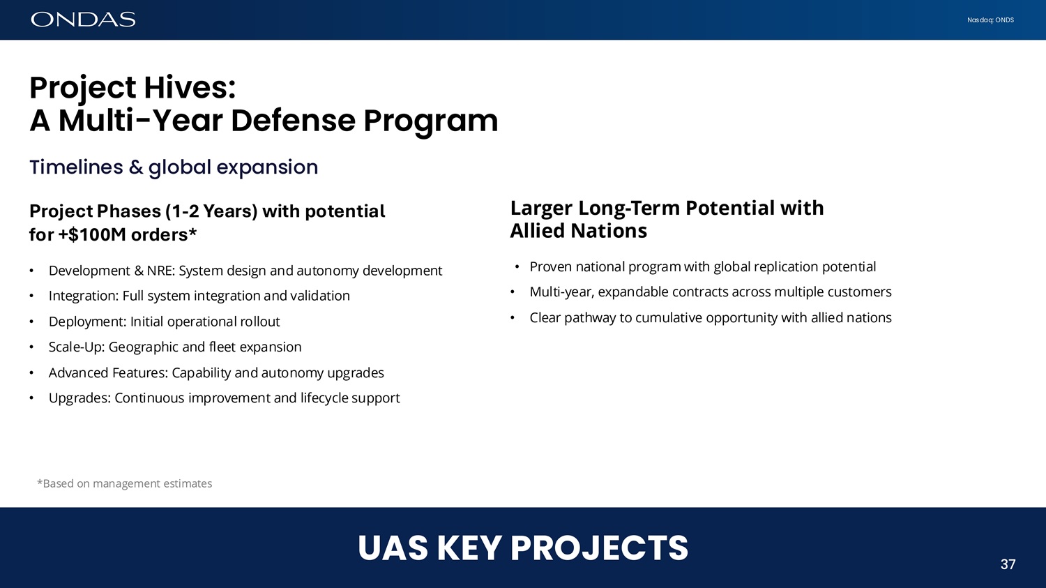 Nasdaq: ONDS Timelines & global expansion Project Phases (1 - 2 Years) with potential for +$100M orders* • Development & NRE: System design and autonomy development • Integration: Full system integration and validation • Deployment: Initial operational rollout • Scale - Up: Geographic and fleet expansion • Advanced Features: Capability and autonomy upgrades • Upgrades: Continuous improvement and lifecycle support Larger Long - Term Potential with Allied Nations • Proven national program with global replication potential • Multi - year, expandable contracts across multiple customers • Clear pathway to cumulative opportunity with allied nations Project Hives: A Multi - Ye6r Defefise Progr6m 36 UAS KEY PROJECTS 37 *Based on management estimates