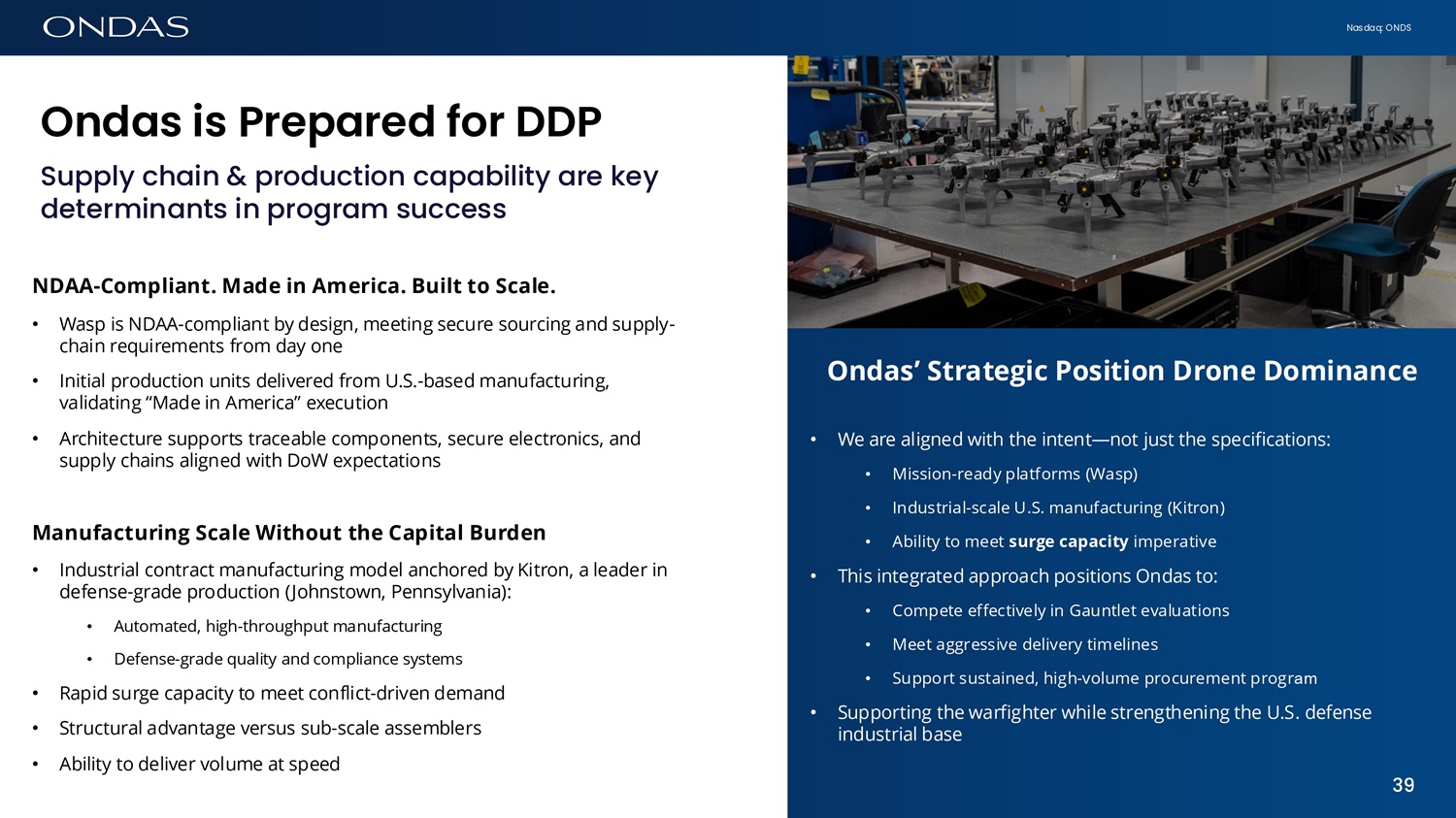 Nasdaq: ONDS $1 Billion DoW program to rapidly field small attack UAS at industrial scale DDP Overview & Strategic Importance • $1 Billion DoW initiative to rebuild the U.S. defense industrial base and rapidly field up to 340,000 low - cost small one - way attack UAS over the next 2 years • Program prioritizes affordability, simplicity, secure supply chains, U.S. manufacturing and production speed — not bespoke platforms • Represents a structural shift from low - rate programs to mass production aligned with modern conflict realities • Initial DoW orders could be placed as early as February 2026 Drofie Domifi6fice Progr6m Wasp Platform: Purpose - Built for DDP • The Wasp is a low - cost, ruggedized small UAS engineered specifically for one - way attack missions • Proven air - to - ground and air - to - air attack mission capability • Manufactured in the U.S. (Pennsylvania) with NDAA - compliant components • American Robotics submitted the Wasp for the DDP in January 2026 The “Wasp” Small One - Way Attack UAS: Purpose - Built for the DDP by American Robotics 36 UAS KEY PROJECTS 38