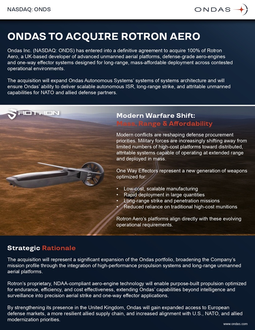 ONDAS TO ACQUIRE ROTRON AERO NASDAQ: ONDS Ondas Inc. (NASDAQ: ONDS) has entered into a definitive agreement to acquire 100% of Rotron Aero, a UK - based developer of advanced unmanned aerial platforms, defense - grade aero - engines and one - way effector systems designed for long - range, mass - affordable deployment across contested operational environments. The acquisition will expand Ondas Autonomous Systems’ systems of systems architecture and will ensure Ondas’ ability to deliver scalable autonomous ISR, long - range strike, and attritable unmanned capabilities for NATO and allied defense partners. Modern Warfare Shift: Mass, Range & Affordability Modern conflicts are reshaping defense procurement priorities. Military forces are increasingly shifting away from limited numbers of high - cost platforms toward distributed, attritable systems capable of operating at extended range and deployed in mass. One Way Effectors represent a new generation of weapons optimized for: • Low - cost, scalable manufacturing • Rapid deployment in large quantities • Long - range strike and penetration missions • Reduced reliance on traditional high - cost munitions Rotron Aero’s platforms align directly with these evolving operational requirements. Strategic Rationale The acquisition will represent a significant expansion of the Ondas portfolio, broadening the Company’s mission profile through the integration of high - performance propulsion systems and long - range unmanned aerial platforms. Rotron’s proprietary, NDAA - compliant aero - engine technology will enable purpose - built propulsion optimized for endurance, efficiency, and cost effectiveness, extending Ondas’ capabilities beyond intelligence and surveillance into precision aerial strike and one - way effector applications. By strengthening its presence in the United Kingdom, Ondas will gain expanded access to European defense markets, a more resilient allied supply chain, and increased alignment with U.S., NATO, and allied modernization priorities. www.ondas.com