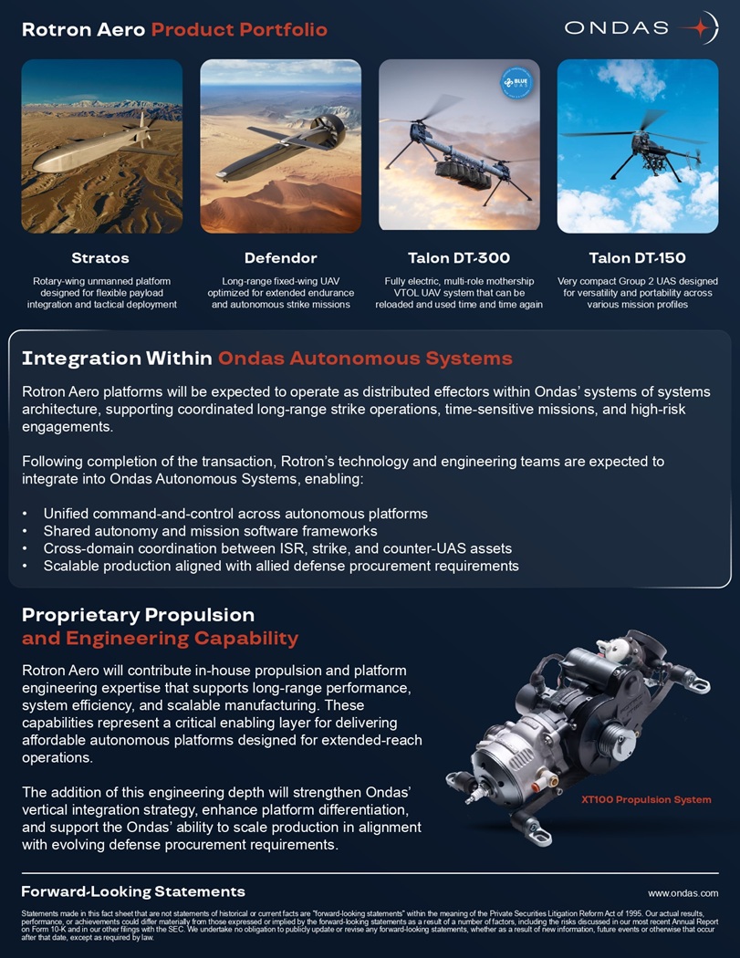 Rotron Aero Product Portfolio Forward - Looking Statements Statements made in this fact sheet that are not statements of historical or current facts are "forward - looking statements" within the meaning of the Private Securities Litigation Reform Act of 1995. Our actual results, performance, or achievements could differ materially from those expressed or implied by the forward - looking statements as a result of a number of factors, including the risks discussed in our most recent Annual Report on Form 10 - K and in our other filings with the SEC. We undertake no obligation to publicly update or revise any forward - looking statements, whether as a result of new information, future events or otherwise that occur after that date, except as required by law. Integration Within Ondas Autonomous Systems Rotron Aero platforms will be expected to operate as distributed effectors within Ondas’ systems of systems architecture, supporting coordinated long - range strike operations, time - sensitive missions, and high - risk engagements. Following completion of the transaction, Rotron’s technology and engineering teams are expected to integrate into Ondas Autonomous Systems, enabling: • Unified command - and - control across autonomous platforms • Shared autonomy and mission software frameworks • Cross - domain coordination between ISR, strike, and counter - UAS assets • Scalable production aligned with allied defense procurement requirements Proprietary Propulsion and Engineering Capability Rotron Aero will contribute in - house propulsion and platform engineering expertise that supports long - range performance, system efficiency, and scalable manufacturing. These capabilities represent a critical enabling layer for delivering affordable autonomous platforms designed for extended - reach operations. The addition of this engineering depth will strengthen Ondas’ vertical integration strategy, enhance platform differentiation, and support the Ondas’ ability to scale production in alignment with evolving defense procurement requirements. XT100 Propulsion System Defendor Long - range fixed - wing UAV optimized for extended endurance and autonomous strike missions Stratos Rotary - wing unmanned platform designed for flexible payload integration and tactical deployment Talon DT - 150 Very compact Group 2 UAS designed for versatility and portability across various mission profiles Talon DT - 300 Fully electric, multi - role mothership VTOL UAV system that can be reloaded and used time and time again www.ondas.com
