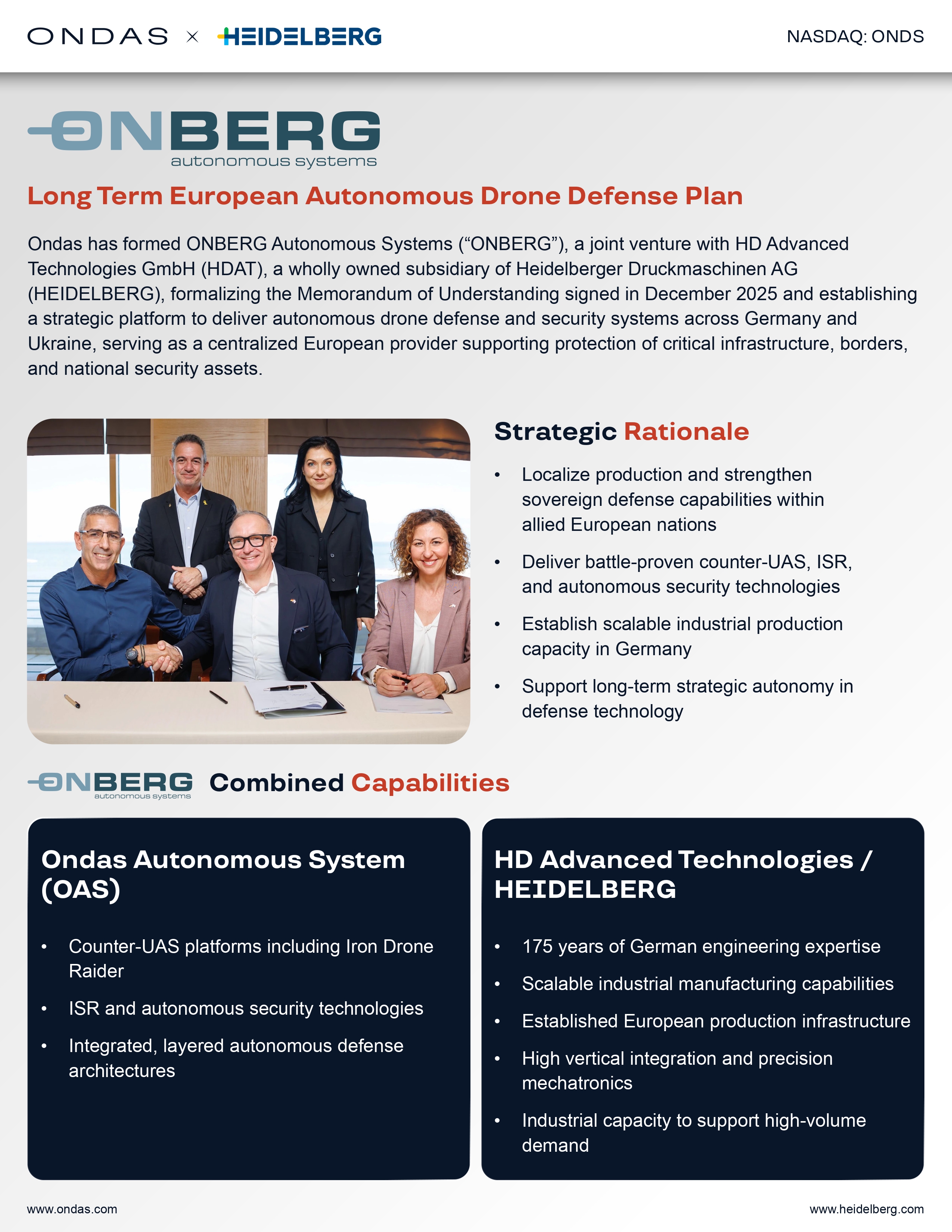 www.heidelberg.com www.ondas.com Long Term European Autonomous Drone Defense Plan NASDAQ: ONDS Ondas has formed ONBERG Autonomous Systems (“ONBERG”), a joint venture with HD Advanced Technologies GmbH (HDAT), a wholly owned subsidiary of Heidelberger Druckmaschinen AG (HEIDELBERG), formalizing the Memorandum of Understanding signed in December 2025 and establishing a strategic platform to deliver autonomous drone defense and security systems across Germany and Ukraine, serving as a centralized European provider supporting protection of critical infrastructure, borders, and national security assets. Strategic Rationale • Localize production and strengthen sovereign defense capabilities within allied European nations • Deliver battle - proven counter - UAS, ISR, and autonomous security technologies • Establish scalable industrial production capacity in Germany • Support long - term strategic autonomy in defense technology Combined Capabilities Ondas Autonomous System (OAS) • Counter - UAS platforms including Iron Drone Raider • ISR and autonomous security technologies • Integrated, layered autonomous defense architectures HD Advanced Technologies / HEIDELBERG • 175 years of German engineering expertise • Scalable industrial manufacturing capabilities • Established European production infrastructure • High vertical integration and precision mechatronics • Industrial capacity to support high - volume demand