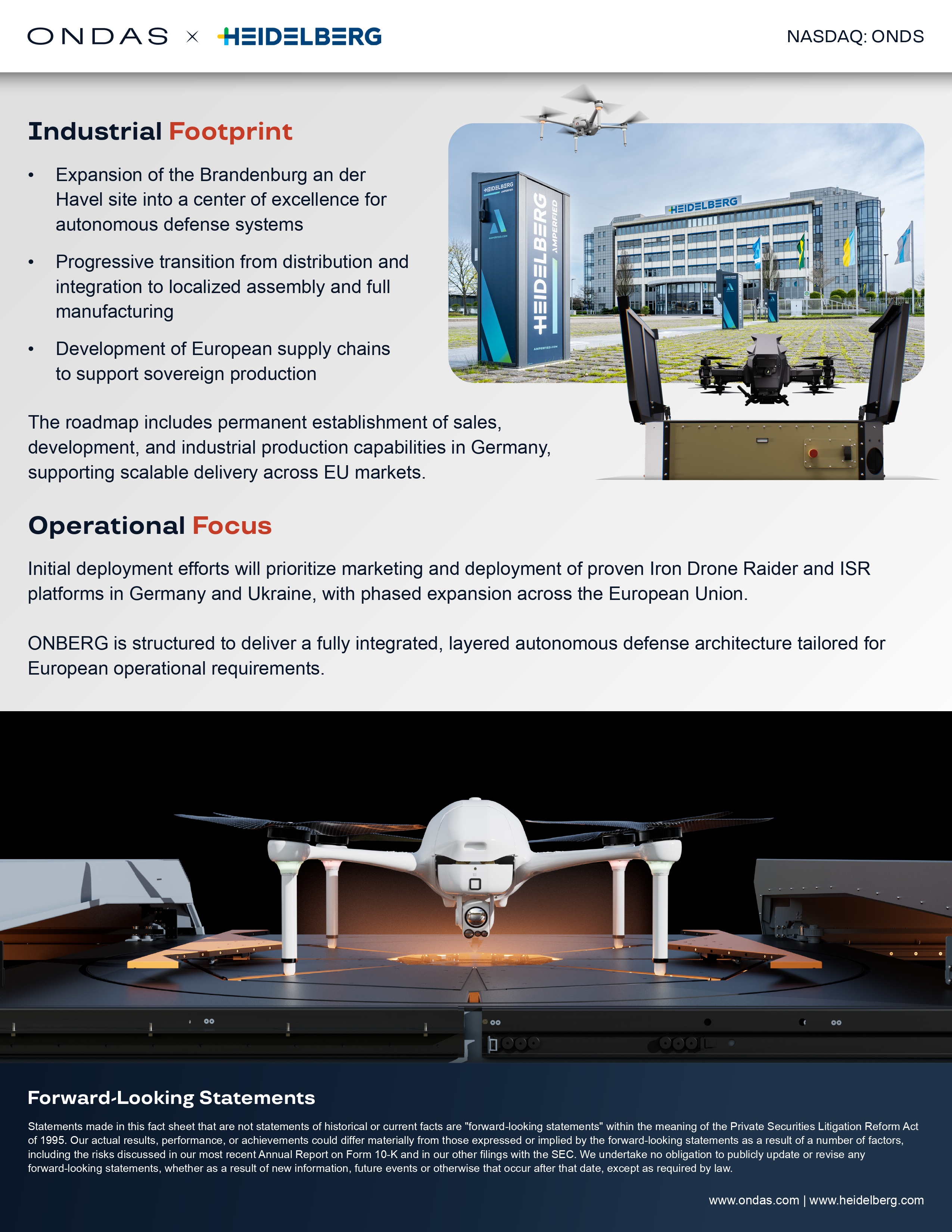 www.ondas.com | www.heidelberg.com NASDAQ: ONDS Forward - Looking Statements Statements made in this fact sheet that are not statements of historical or current facts are "forward - looking statements" withi n the meaning of the Private Securities Litigation Reform Act of 1995. Our actual results, performance, or achievements could differ materially from those expressed or implied by the forw ard - looking statements as a result of a number of factors, including the risks discussed in our most recent Annual Report on Form 10 - K and in our other filings with the SEC. We undertake no obligation to publicly update or revise any forward - looking statements, whether as a result of new information, future events or otherwise that occur after that date, excep t as required by law. Industrial Footprint • Expansion of the Brandenburg an der Havel site into a center of excellence for autonomous defense systems • Progressive transition from distribution and integration to localized assembly and full manufacturing • Development of European supply chains to support sovereign production Operational Focus Initial deployment efforts will prioritize marketing and deployment of proven Iron Drone Raider and ISR platforms in Germany and Ukraine, with phased expansion across the European Union. ONBERG is structured to deliver a fully integrated, layered autonomous defense architecture tailored for European operational requirements. The roadmap includes permanent establishment of sales, development, and industrial production capabilities in Germany, supporting scalable delivery across EU markets.