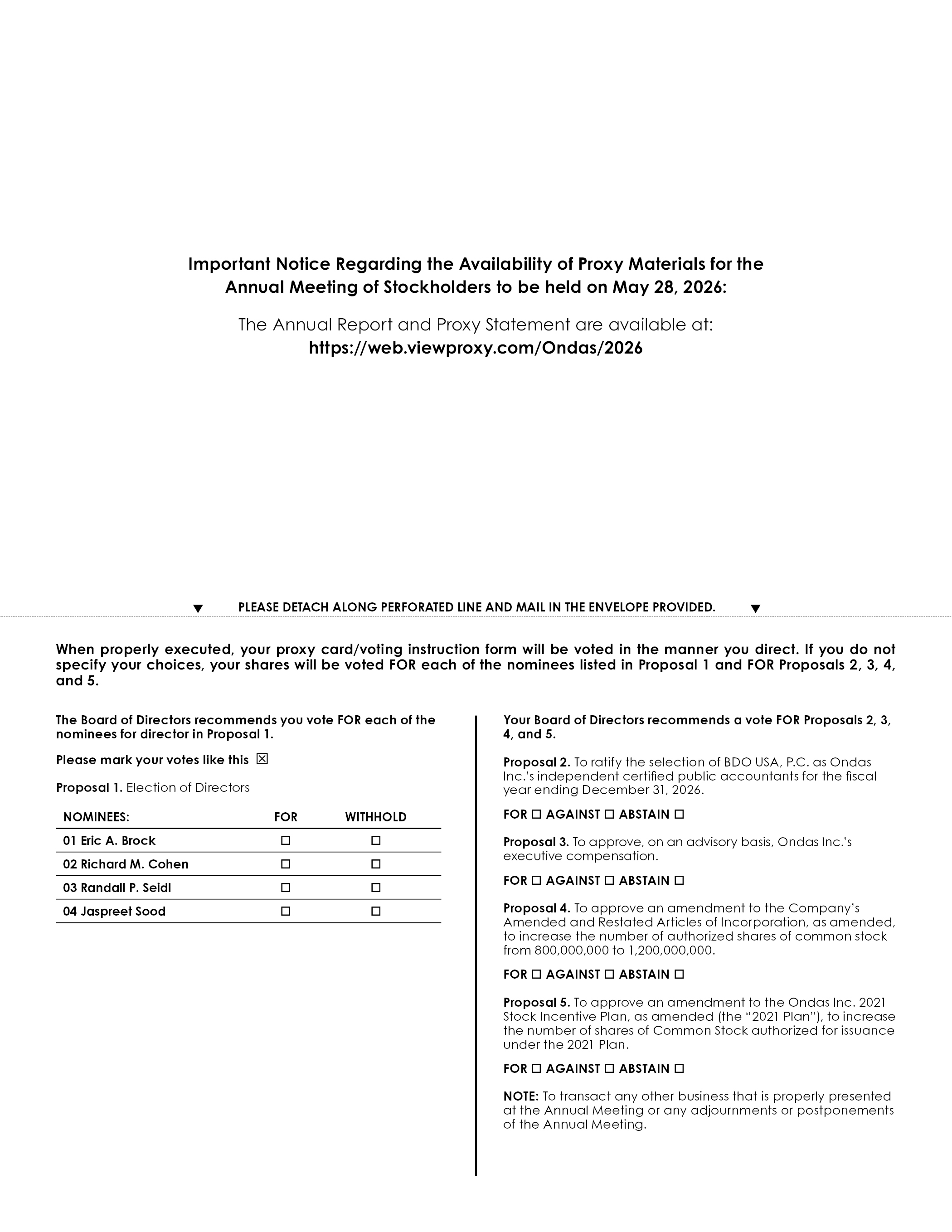 Important Notice Regarding the Availability of Proxy Materials for theAnnual Meeting of Stockholders to be held on May 28, 2026: The Annual Report and Proxy Statement are available at:https://web.viewproxy.com/Ondas/2026 PLEASE DETACH ALONG PERFORATED LINE AND MAIL IN THE ENVELOPE PROVIDED. When properly executed, your proxy card/voting instruction form will be voted in the manner you direct. If you do not specify your choices, your shares will be voted FOR each of the nominees listed in Proposal 1 and FOR Proposals 2, 3, 4, and 5. The Board of Directors recommends you vote FOR each of the nominees for director in Proposal 1. Please mark your votes like this Proposal 1. Election of Directors NOMINEES: 01 Eric A. Brock 02 Richard M. Cohen 03 Randall P. Seidl 04 Jaspreet Sood FOR WITHHOLD Your Board of Directors recommends a vote FOR Proposals 2, 3, 4, and 5. Proposal 2. To ratify the selection of BDO USA, P.C. as Ondas Inc.’s independent certified public accountants for the fiscal year ending December 31, 2026. FOR AGAINST ABSTAIN Proposal 3. To approve, on an advisory basis, Ondas Inc.’s executive compensation. FOR AGAINST ABSTAIN Proposal 4. To approve an amendment to the Company’s Amended and Restated Articles of Incorporation, as amended, to increase the number of authorized shares of common stock from 800,000,000 to 1,200,000,000. FOR AGAINST ABSTAIN Proposal 5. To approve an amendment to the Ondas Inc. 2021 Stock Incentive Plan, as amended (the “2021 Plan”), to increase the number of shares of Common Stock authorized for issuance under the 2021 Plan. FOR AGAINST ABSTAIN NOTE: To transact any other business that is properly presented at the Annual Meeting or any adjournments or postponements of the Annual Meeting.